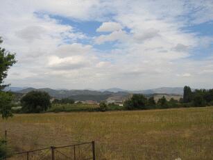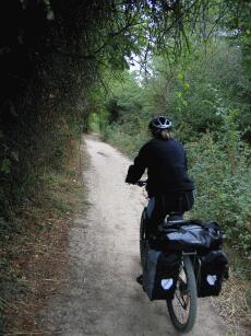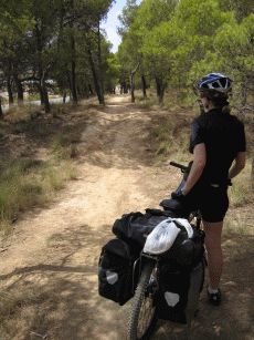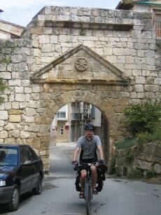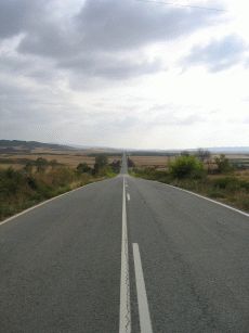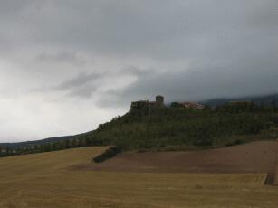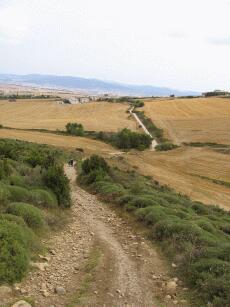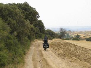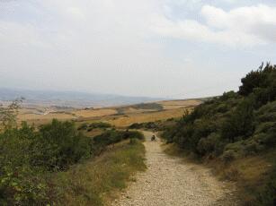 Und wer gedacht hatte, nach dem Kamm des Pedron ginge es entspannt bergab, der sieht sich mit einem Weg voller Geröll konfrontiert, den man schlechterdings nicht befahren kann. Also auch noch bergab "schieben", vorausgesetzt, man kann das Rad mit dem Gepäck dran überhaupt halten. Später geht es dann auch mal wirklich fahrbar bergab und mit letzter Kraft bewältigt der Radpilger dann die letzten der nur 27 km bis nach Puente de la Reina. Im dortigen Refugio - ansonsten sehr nett - bin ich dann vom Schnarrchen der anderen im voll besetzten Schlafsaal so angenervt gewesen, dass ich ab Mitternacht mit Liegematte und Schlafsack ins Freie gewechselt bin; etwas kalt, aber dennoch besser. Am nächsten Morgen bei leichtem Nieseln losgefahren, teils auf Straßen, später wieder auf dem Pfad selbst durch Wein- und andere Felder