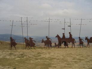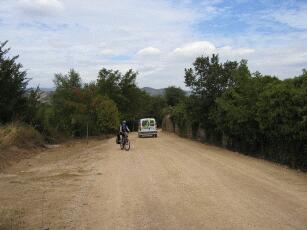Freundlich wurden wir von einem Pilgerbetreungsfahrzeug gefragt, 'wohin es denn heute noch gehen solle'. Übrigens das einzige auf der ganzen Reise, so dass sich die Vermutung aufdrängt, dass hier lediglich solche Pilger aus dem Verkehr gezogen werden sollen, die sich zu lange unter die gute Quelle gehängt haben ...