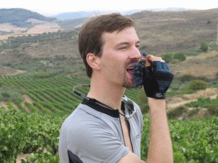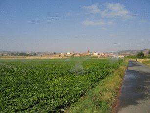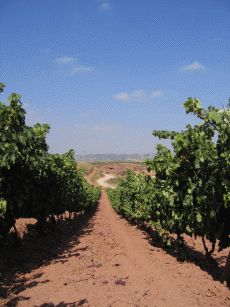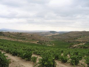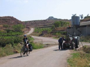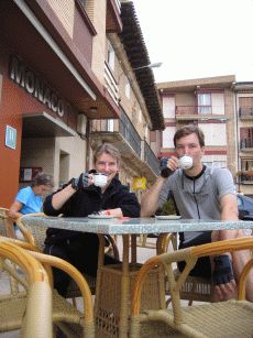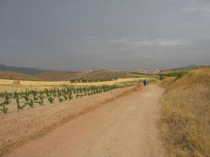 und bleiben im altertümlichen Refugio - nett dort und sogar eine Waschmaschine gibt es ! Am nächsten Morgen sind wir recht bald in Najera - nur dass wir das nicht wissen, denn wo wir hineinfahren steht kein Ortseingangsschild. Erst später wird uns klar, was die Einheimischen gedacht haben müssen als wir radebrechend nach dem Weg nach Najera fragten. Durch wunderschöne Weinberge (eher -hügel) und an zur Mittagsstunde heftig bewässerten Feldern vorbei (ja, in Spanien herrscht Wasserknappheit!) ziehen wir weiter unserer Wege. Inzwischen sind die Vormittage nicht mehr so herrlich bedeckt wie anfangs, so dass man schon recht ins Schwitzen kommt.
