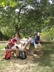 An einem Pilgerrastplatz treffen wir eine handvoll Fußpilger die für uns schiebende gute Tipps aber auch ein Stück Schokolade bereit haben, bevor es weitergeht.