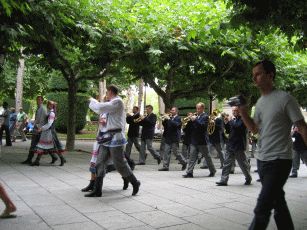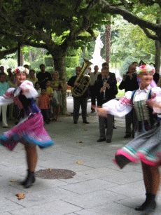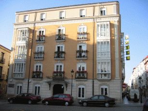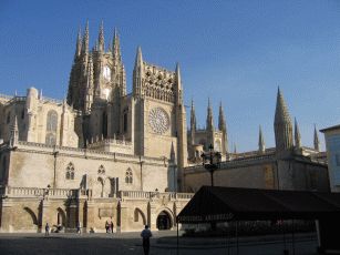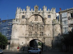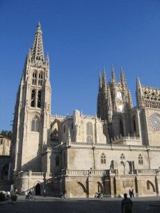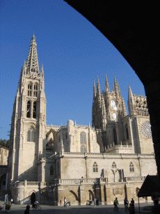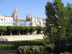 Zur Mittagsstunde treffen wir leider auch eine sehr lästige Gruppe dümmlich lautschwatzender Touristen aus dem Ruhrgebiet, die man hier nun wirklich nicht erwartet hätte und die deshalb umso mehr nerven (Stichwort: "Da sehen wir mal wieder, wo unsere EU-Steuergelder hingehen" - echt schlimmstes Stammtischniveau aus Herne). Schnell weiter und wir erreichen Burgos. Die Stadt hat einen wunderschönen alten Kern. Kurz nachdem wir an der Flaniermeile in einem Café Platz genommen haben, kommt von der Kathedrale eine Musikantentruppe hermarschiert, die just vor uns Zwischenstop machen und zur Musik wird getanzt; so möchte man empfangen werden ! Wir beziehen das in der Altstadt gelegene und angenehm eingerichtete Hotel Norte y Londres und suchen nach etwas essbarem. Nur knapp entgehen wir der üblichen Öffnungszeitenfalle der Cervezeria, als wir um 15.30 Uhr endlich einen Platz finden. Der Kellner ist gnädig und wir bekommen was leckeres in den Magen, bevor wir die Altstadt mit der Kathedrale, dem alten Stadttor und dem wunderschönen Fluß näher ansehen.