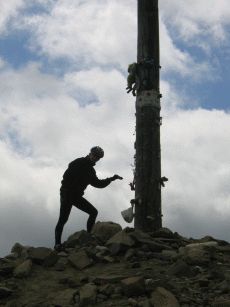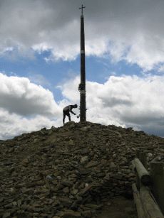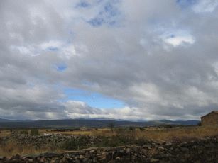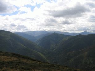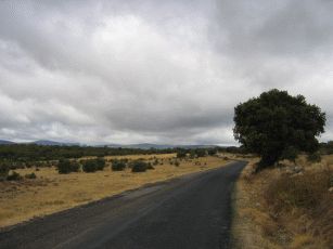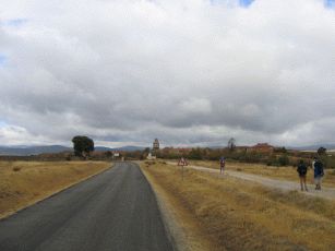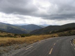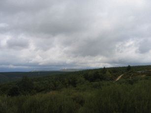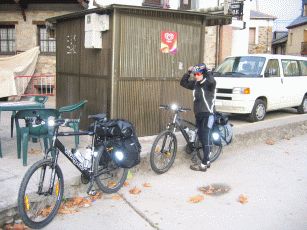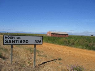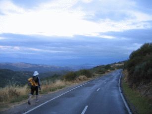und dann beginnt ein sehr langer Anstieg auf 1.400 Meter, der hier durch den stetigen Gegenwind und gelegentlichen Nieselregen noch beschwerlicher wird. Wir erleben einen zweiten Tiefpunkt. Nach einer kleinen Pause - auch wegen Regens - müssen wir weiter bergauf. In einem kleinen und ansonsten verlassenen Bergdorf wollen wir wegen des Regens und der Anstrengung abbrechen ein Refugio beziehen - das prompt "Completo" ist. Nun sinkt die Stimmung ins bodenlose. Durch den Regen und den schneidend kalten Wind kämpfen wir uns auch die letzten vier km bergauf bis zum "Cruz de Fero" - dem Eisenkreuz auf 1.500 m. Nach guter Pilgertradition wollen wir zwei aus Berlin mitgebrachte Steine ablegen und müssen uns anstellen: Eine Gruppe Bustouristen hat einen kleinen Bergspaziergang gemacht, dabei Steine aufgelesen und belegt nun rücksichtslos für schier endlose Zeit das kleine Stückchen Erde, um sich dort in Szene zu setzen. Von hier aus geht es immer noch nicht dauerhaft bergab, sondern teils auch wieder bergauf, so dass erst mal wenig Freude aufkommt - von Erwärmung ganz zu Schweigen. Nach einiger weiterer Zeit erreichen wir die Herberge in El Acebo - leider konnten wir nicht mehr, so dass es müßig ist, zu philosophieren, dass wir besser weiter gefahren wären. Eine wahrhaft "lumpige Herberge", wie Verena in ihrem Tagebuch vermerken wird. Nicht mal Frühstück in der dazugehörigen Bar gibt es. Wir brechen in aller Frühe auf, nun dauerhaft bergab. Das ist vor Sonnenaufgang empfindlich kühl und dauert fast eine Stunde.